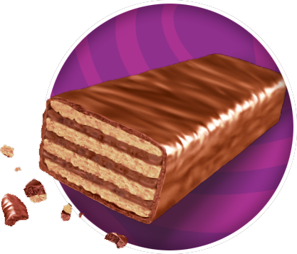 Crujiente barrita de barquillo cubierto de chocolate con leche y con relleno (44%) con cacao.